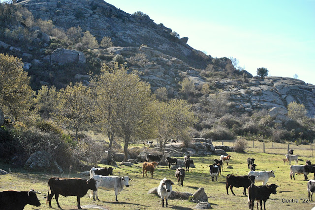 Estas vacas de Martínez, pastan en una finca ya muy cercana a la cima de la sierra, en la zona de Colmenar de Arroyo, y lo hacen buscando el sustento por el valle a la espera del alimento extra. Cuando José Manuel las llama y comienza a abrir los sacos de tacos, se acercan con más recelo y precaución que otra cosa, aunque al poco rato y al ser pocos y poco molestos, nos "aceptan" sin dejar de marcar sus distancias y podemos andar entre ellas con las debidas cautelas, porque no en vano, el ganadero tuvo ya un susto tremendo que casi le cuesta la vida en el año 2020. "Este encaste no es como Santa Coloma, que te avisa primero, éstas cuando se arrancan, van hasta el final".